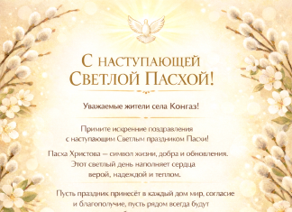 Уважаемые жители села Конгаз! Примите искренние поздравления с наступающим Светлым праздником Пасхи! Пусть праздник Пасхи принесёт в каждый дом мир, согласие и благополучие, укрепит духовные...