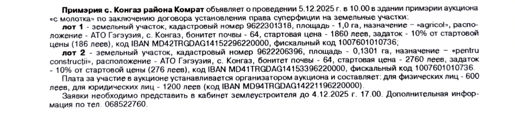 В здании примэрии села Конгаз 05 декабря 2025г. в 10:00 состоится аукцион «с молотка» по аренде земли с заключением договора установления права суперфиции сроком на 10 лет .