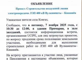 В примэрии Конгаз состоится информационная встреча с собственниками земельных участков по...