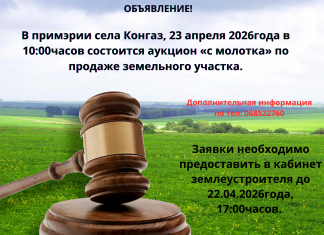 В здании примэрии села Конгаз 23 апреля 2026 г. в 10:00 состоится аукцион "с молотка" по продаже земельного участка: