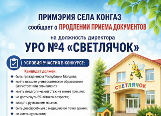 Примэрия села Конгаз сообщает о продлении приема документов на должность директора УРО №4 «Светлячок». Условия участия в конкурсе:   Кандидат должен: - быть гражданином Республики Молдова; - иметь...