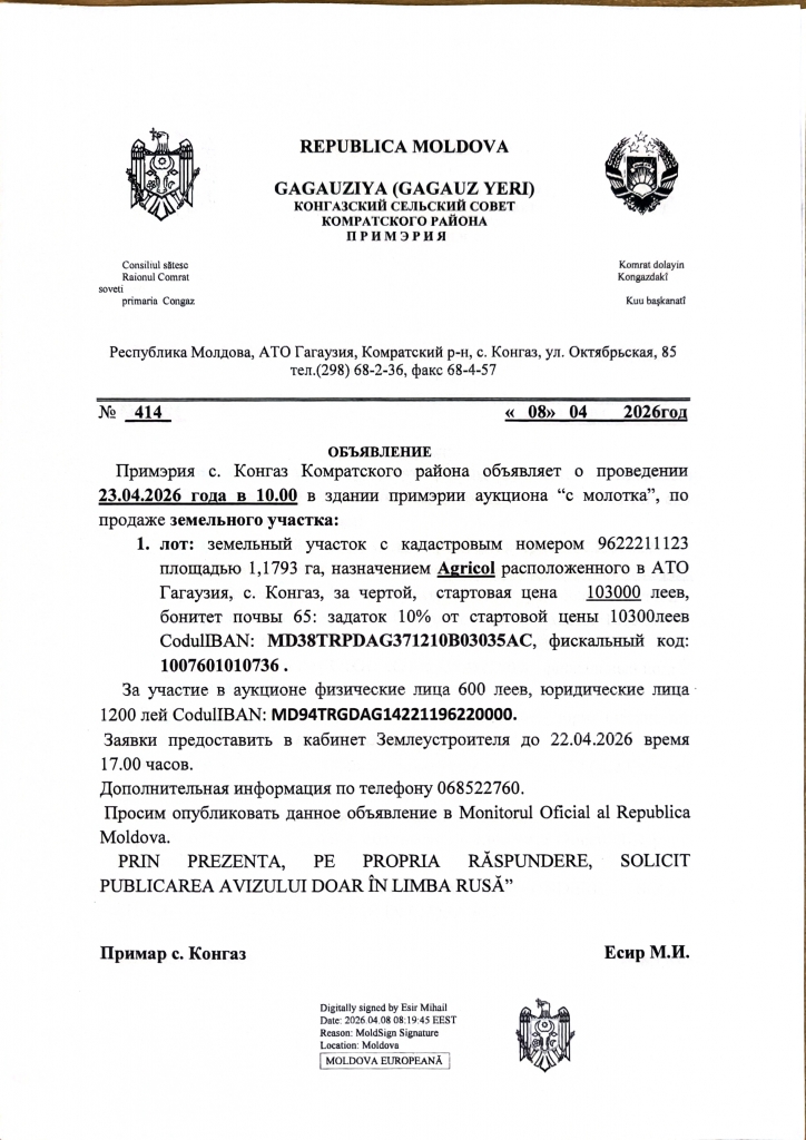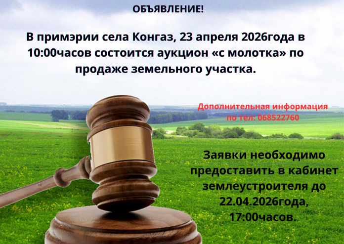 В здании примэрии села Конгаз 23 апреля 2026 г. в 10:00 состоится аукцион «с молотка» по продаже земельного участка: