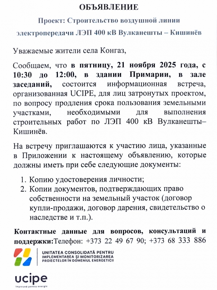 Сообщаем, что в пятницу, 21 ноября 2025 года, с 10:30 до 12:00, в зале заседаний примэрии села Конгаз состоится информационная встреча, организованная UCIPЕ, для лиц, чьи земельные участки задействованы в рамках проекта строительства воздушной линии электропередачи ЛЭП 400 кВ Вулкэнешты – Кишинёв.