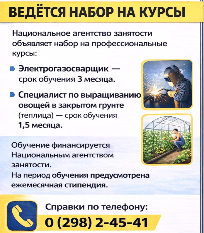 НовостиОбъявления Национальное агентство занятости объявляет набор на профессиональные курсы 12.02.2026 36 Facebook Twitter Linkedin Ведётся набор на курсы! Национальное агентство занятости объявляет набор на профессиональные курсы: Электрогазосварщик — срок обучения 3 месяца. Специалист по выращиванию овощей в закрытом грунте (теплица) — срок обучения 1,5 месяца. Обучение финансируется Национальным агентством занятости. На период обучения предусмотрена ежемесячная стипендия. Справки по телефону: 0 (298) 2-45-41.