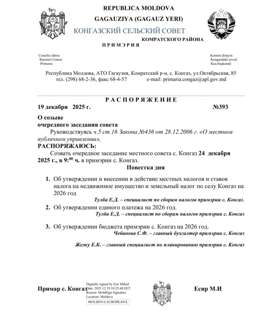 Примэрия села Конгаз информирует о проведении Очередного заседания Местного совета, которое состоится: