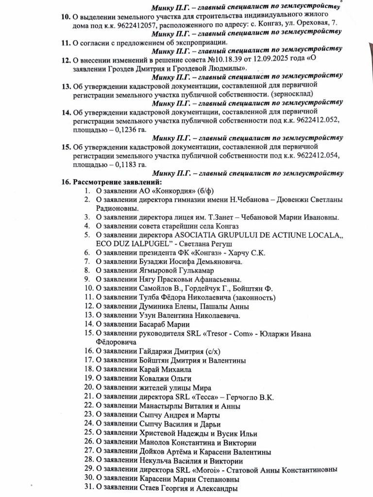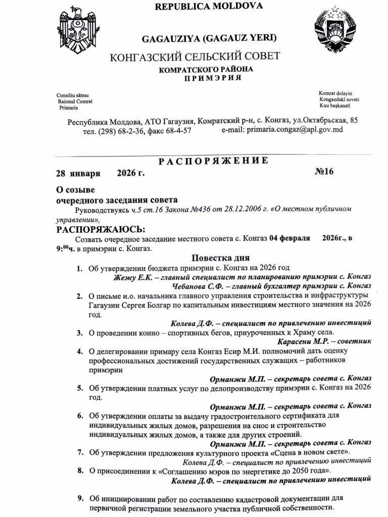 НовостиОбъявления Объявление о проведении очередного заседания Местного совета села Конгаз. 28.01.2026 40 Facebook Twitter Linkedin Объявление о проведении очередного заседания Местного совета села Конгаз. Примэрия села Конгаз информирует о проведении очередного заседания Местного совета, которое состоится: 4 февраля 2026 года; в 09:00; в зале заседаний примэрии села Конгаз (2-й этаж). Повестка дня ниже прилагается.
