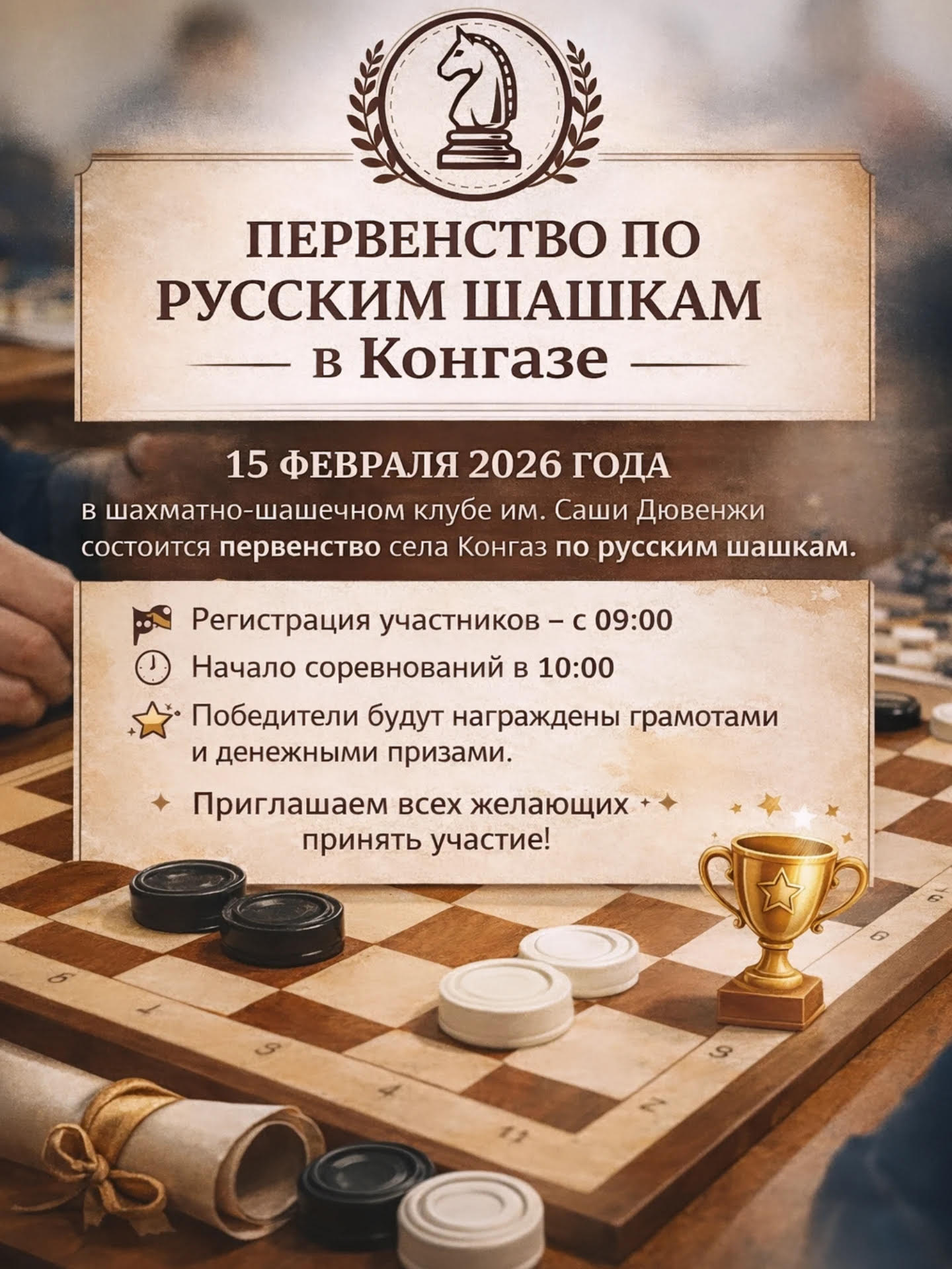 15 февраля 2026 года в шахматно-шашечном клубе им. Саши Дювенжи состоится первенство села Конгаз по русским шашкам.