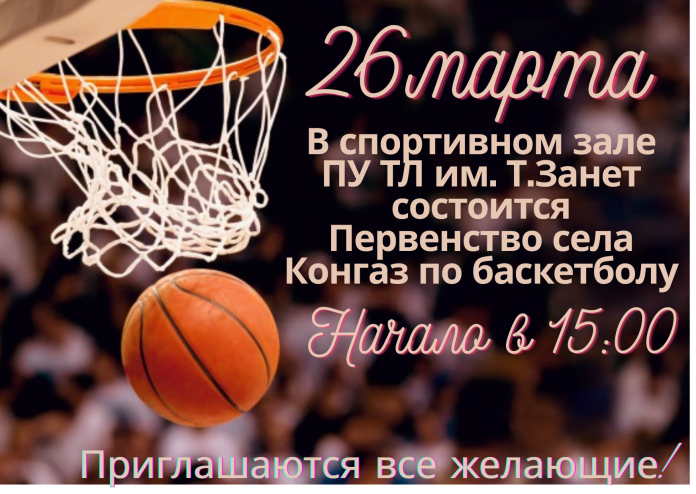 НовостиОбразование, культура, туризм и спортОбъявления Первенство села Конгаз по баскетболу пройдет в спортивном зале ПУ ТЛ им. Т.Занет 25.03.2026 32 Facebook Twitter Linkedin Первенство села Конгаз по баскетболу! 26 марта 2026 года в спортивном зале ПУ ТЛ им. Т. Занет состоится первенство села Конгаз по баскетболу. Начало соревнований — в 15:00. Приглашаются все желающие!
