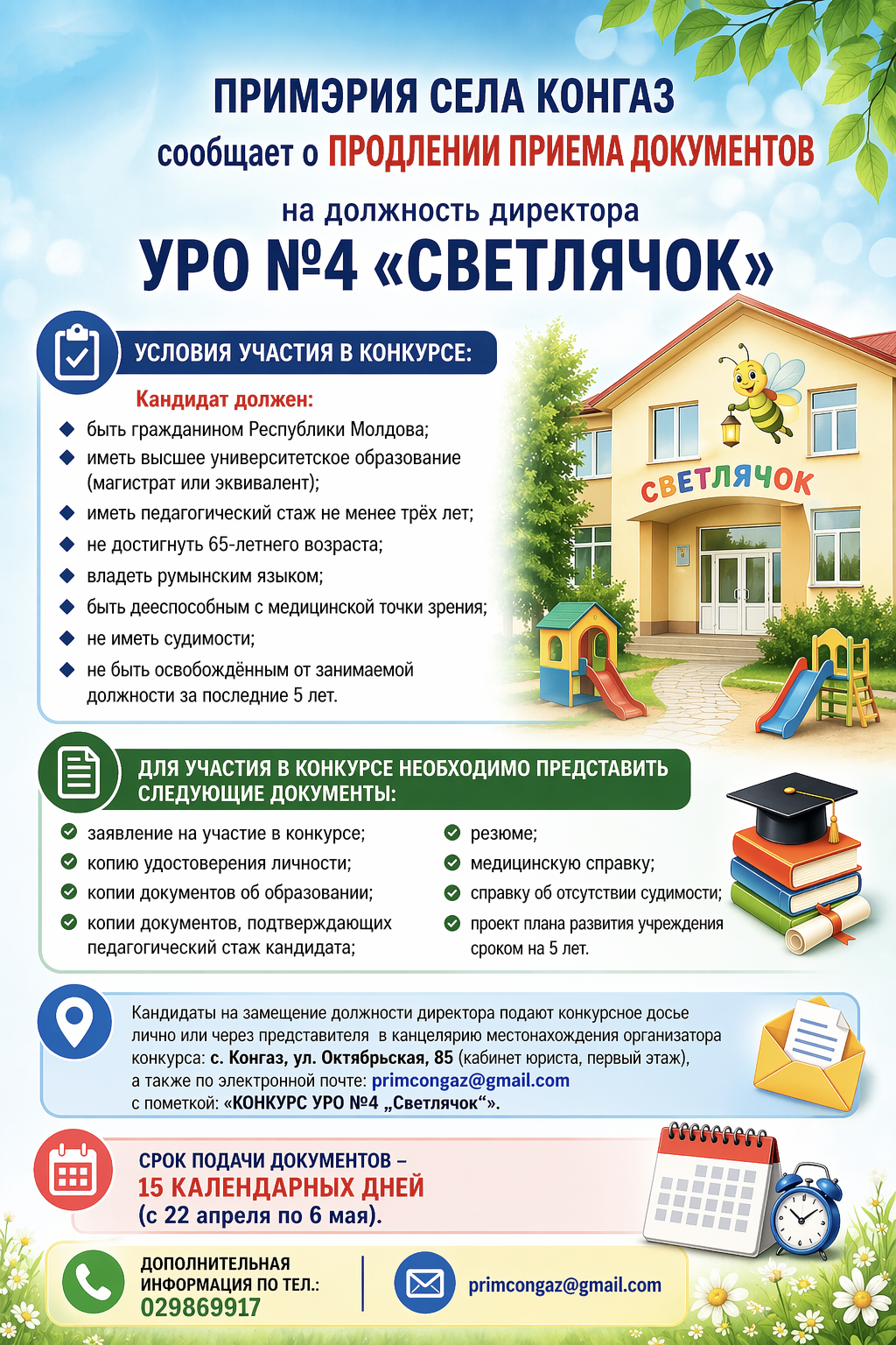 Примэрия села Конгаз сообщает о продлении приема документов на должность директора УРО №4 «Светлячок».
