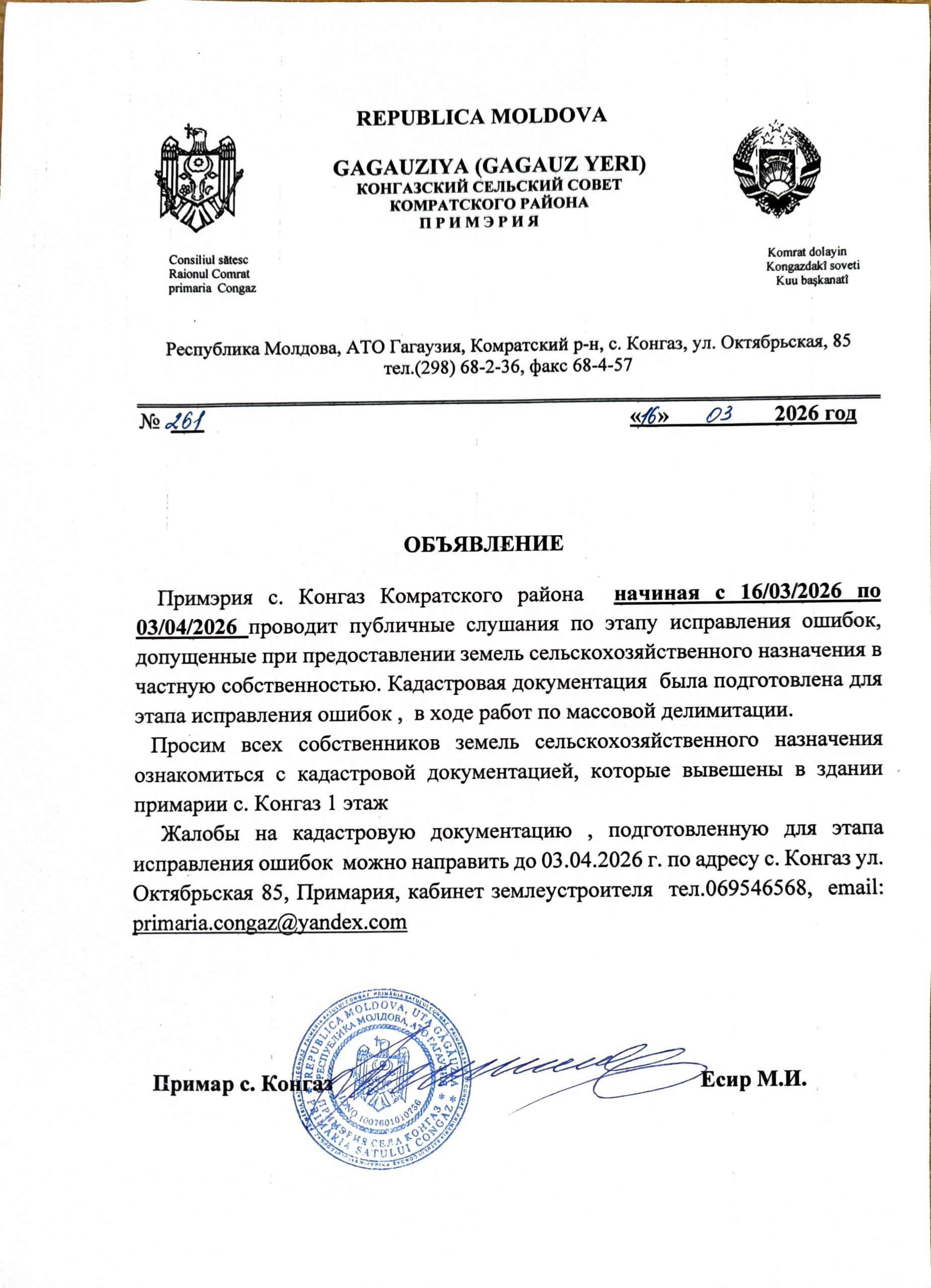 Примэрия села Конгаз информирует, что в период с 16 марта по 3 апреля 2026 года проводятся публичные слушания по этапу исправления ошибок, допущенных при предоставлении земель сельскохозяйственного назначения в частную собственность.