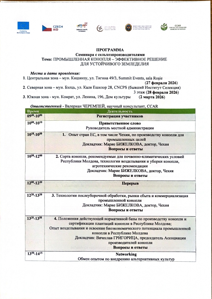 Семинар организован CCAR в сотрудничестве с Министерством сельского хозяйства и пищевой промышленности, Чешским агентством развития (CzDA) и Ассоциацией производителей промышленной конопли Республики Молдова.