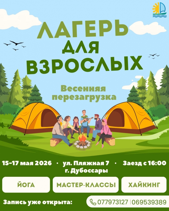 С 15 по 17 мая 2026 года в г. Дубоссары (ул. Пляжная, 7) состоится лагерь для взрослых «Весенняя перезагрузка» 🌿