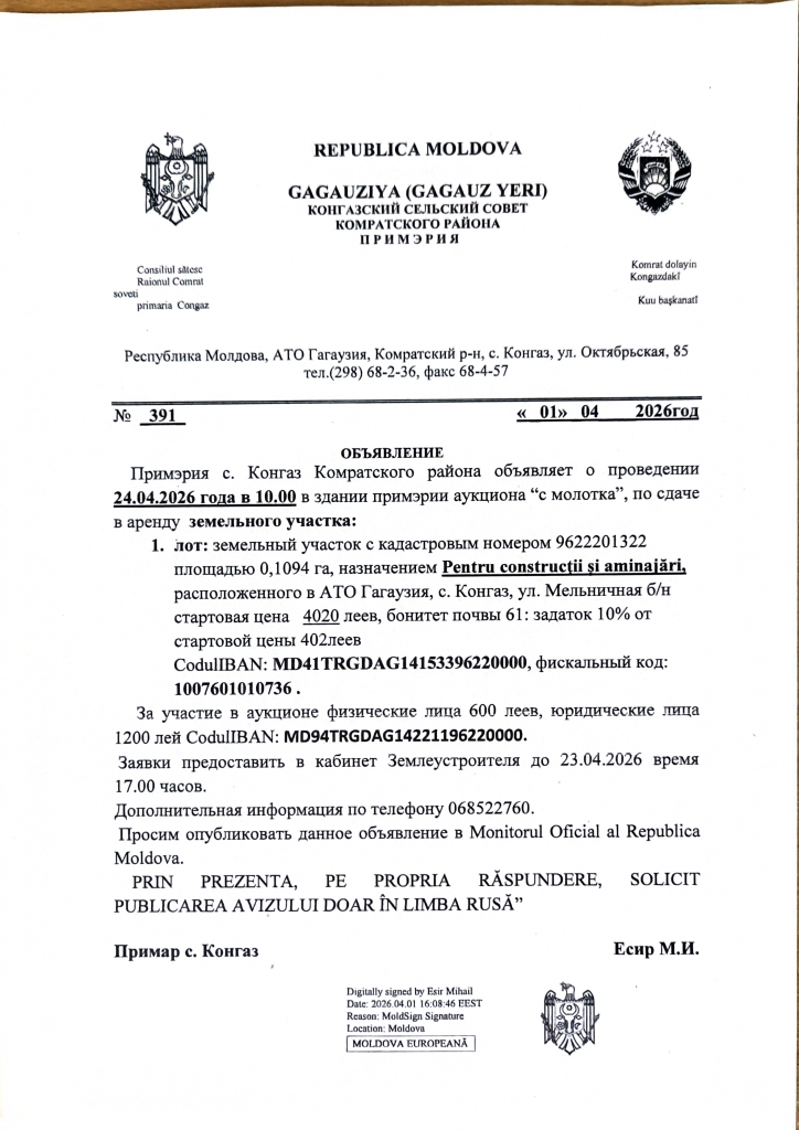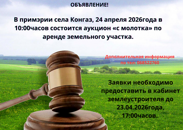 В здании примэрии села Конгаз 24 апреля 2026г. в 10:00 состоится аукцион «с молотка» по сдаче в аренду земельного участка :