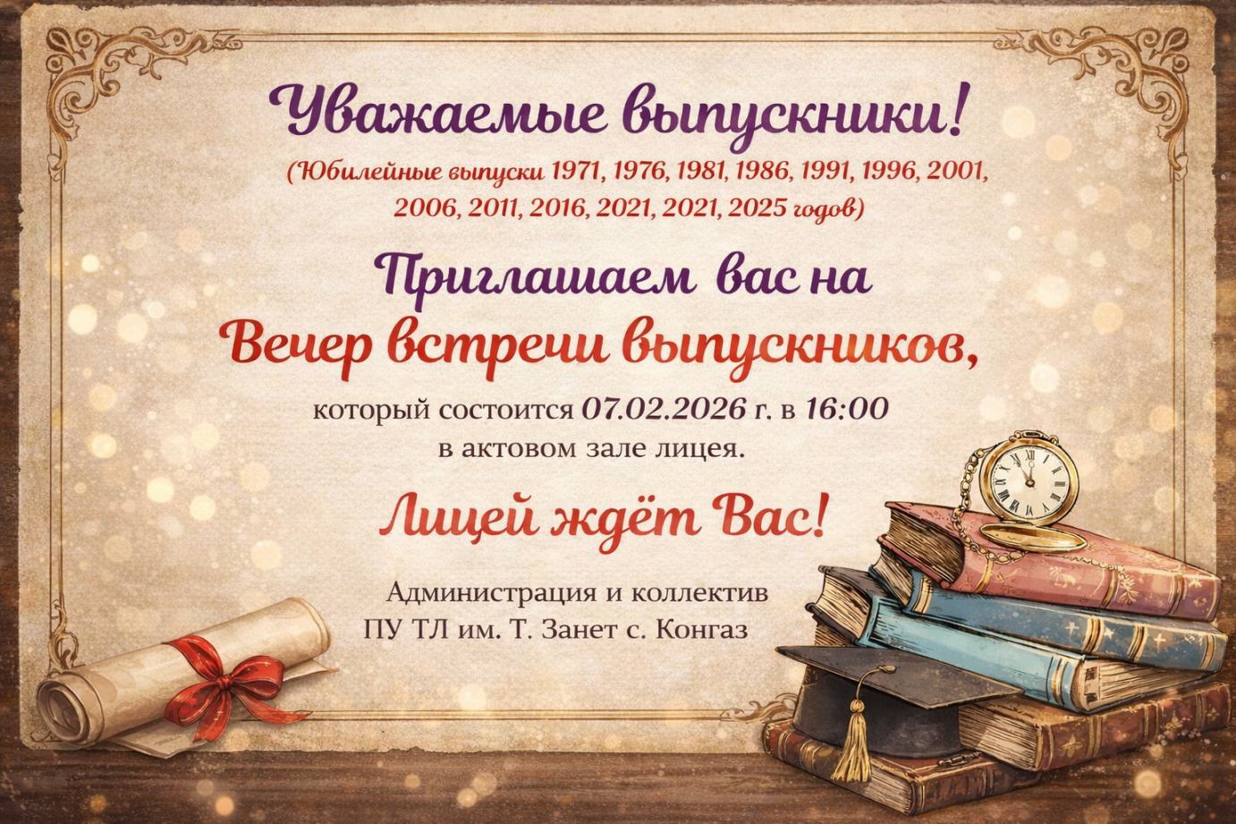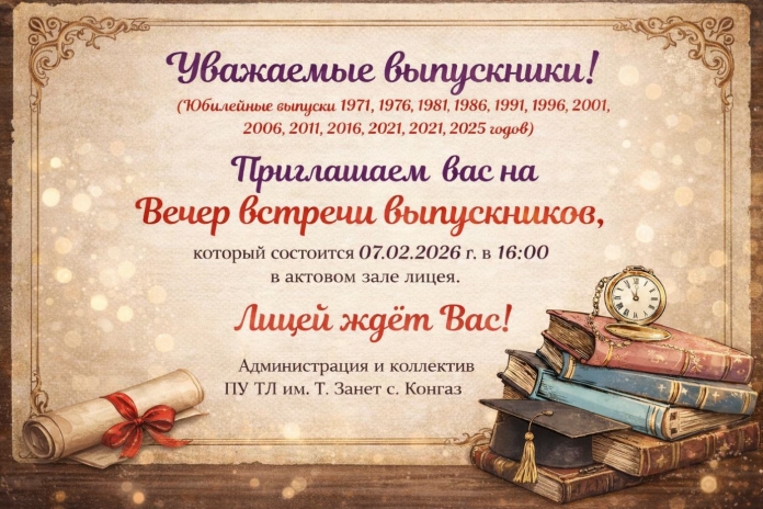 Администрация ПУ ТЛ им. Т. Занет села Конгаз приглашает выпускников на Вечер встречи выпускников, который состоится 7 февраля 2026 года в 16:00 в актовом зале лицея.
