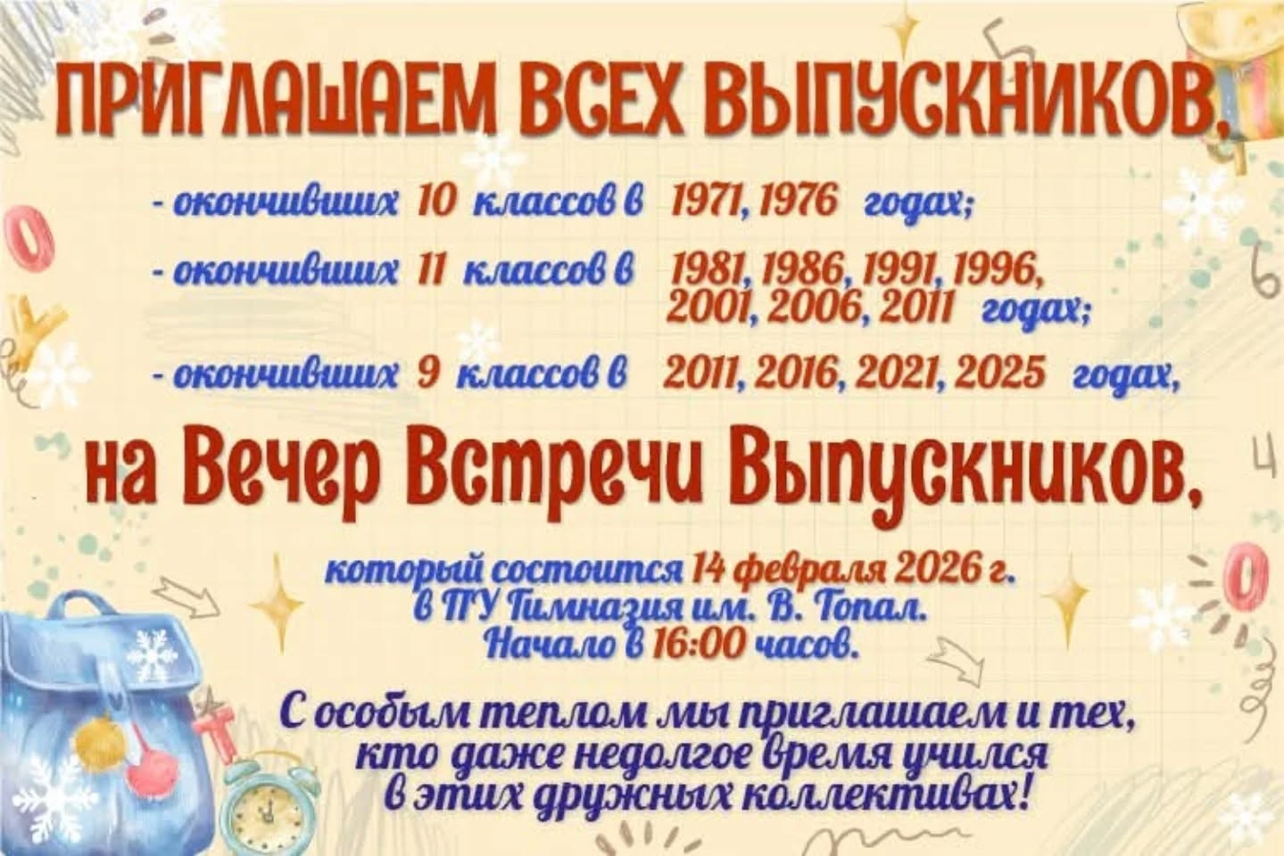 ПУ гимназия им. В. Топал приглашает выпускников на традиционный Вечер встречи, который объединит разные поколения в тёплой и дружеской атмосфере.