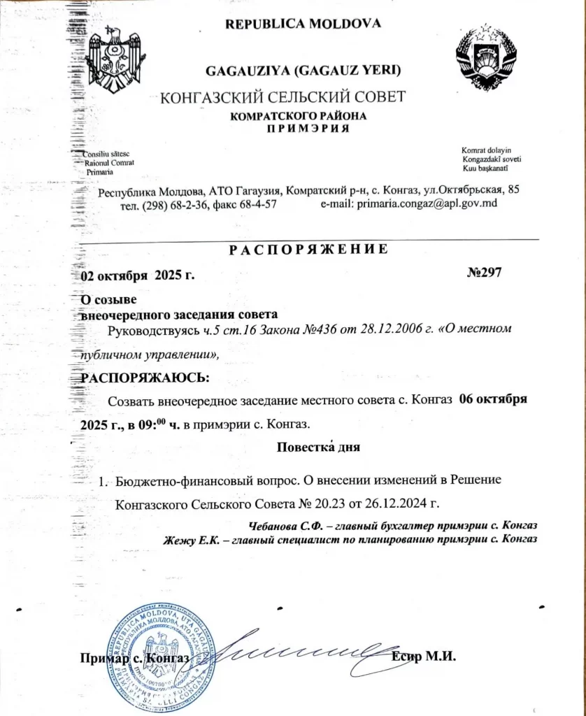 Заседания местного советаОбъявления Внеочередное заседание Местного совета села Конгаз. 03.10.2025 36 Facebook Twitter Linkedin Внеочередное заседание Местного совета села Конгаз. По распоряжению примара, 6 октября 2025 года в 09:00 в зале заседаний примэрии (2-й этаж) пройдет Внеочередное заседание Местного совета села Конгаз. Повестка дня прилагается.